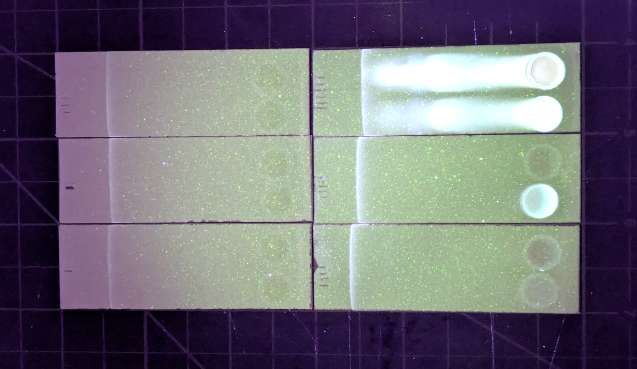 - Spotting samples on the plates one at a time, then running them a few days later, gave smeary messes. Run them soon after the spots dry. Once you’ve run the plate, you can keep it and compare it to others - so e.g. as long as I stick with the same volume of liquid and the same solvent I should be able to run future samples without needing to re-do the calibration ones