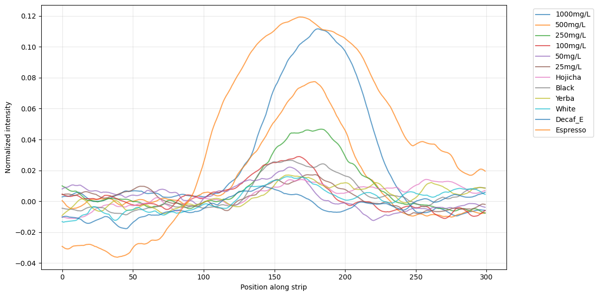 This is already enough if all you care about is a rough measure of whether something is decaf, for example. But to make things a bit more quantitative, I loaded the image into solveit (an interactive jupyter-like environment) and grabbed the pixel values around each sample region, averaged and smoothed them, and plotted the results.