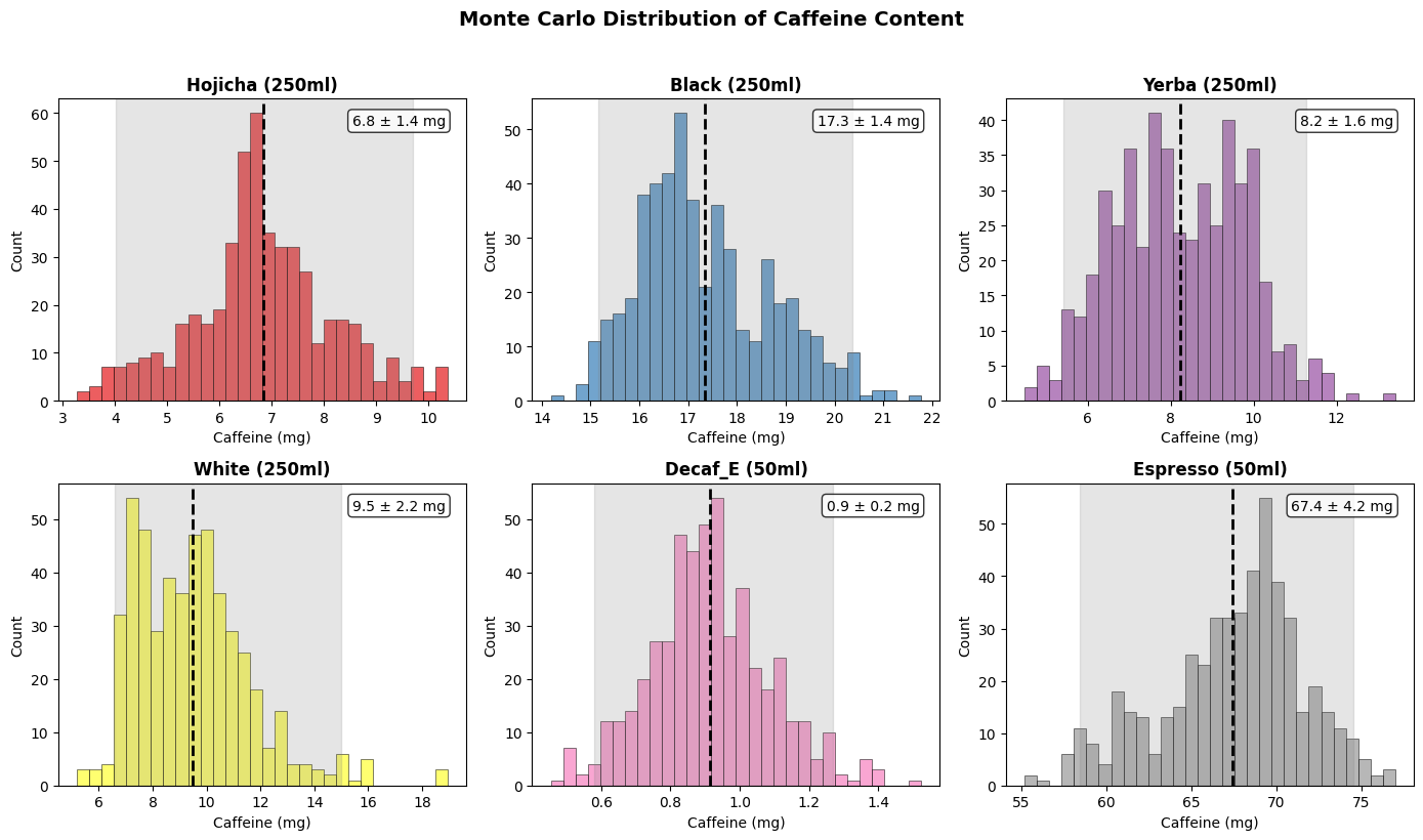As expected, decaf coffee < hojicha < white tea < black tea << espresso. The tea and yerba here are brewed my way, which is weak sauce. I tend to pour hot water (temp depending on tea) over the tea leaves or teabag, swish it around, and serve. Coming soon: results for brewing as the teas’ containers suggest.