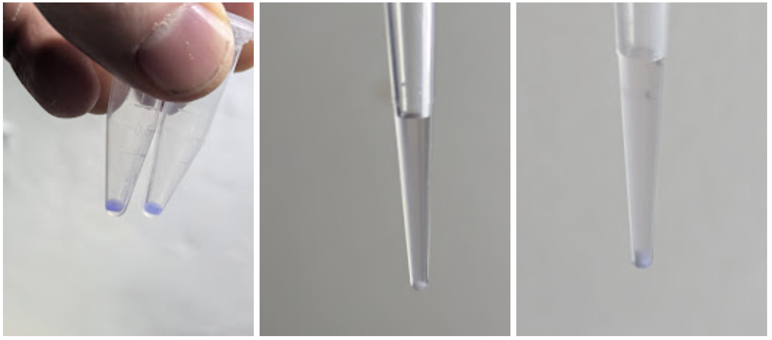 One test was thus, can we stick DNA to DE? Both are ~slightly negatively charged, so I tried one test with DE slurry + plasmid soln (my ~failed BLY_GREEN) w/ methylene blue to stain the DNA + water, and a second with the same but 50mM CaCL2 solution instead of water. The CaCl2 contributes +ve calcium ions which might (the theory goes) form a bridge. Indeed, it seemed like the DE that settled out in the CaCl2 version was bluer than the whiteish version with just water. (A better test would be to use a better DNA stain to check the water bit to see how much DNA is left). In another test, DE mixed with DNA + MB both with and without CaCl2 was added to lots more water and then spun down in a diy centrifuge - the pellet in both was blue, but the water-only pellet rapidly disperse on handling while the CaCl2 version was stable - my suspicion is that it causes clumping (pro gene gun prep involves sonicating to break up clumps). If that’s the case, then skipping the CaCl2 might be better - the DNA is still likely to coat the carrier if e.g. we let a drop evaporate and it is left with tons of surface area of silica DE vs a relatively small area of hydrophobic cling-film. More testing to do :)