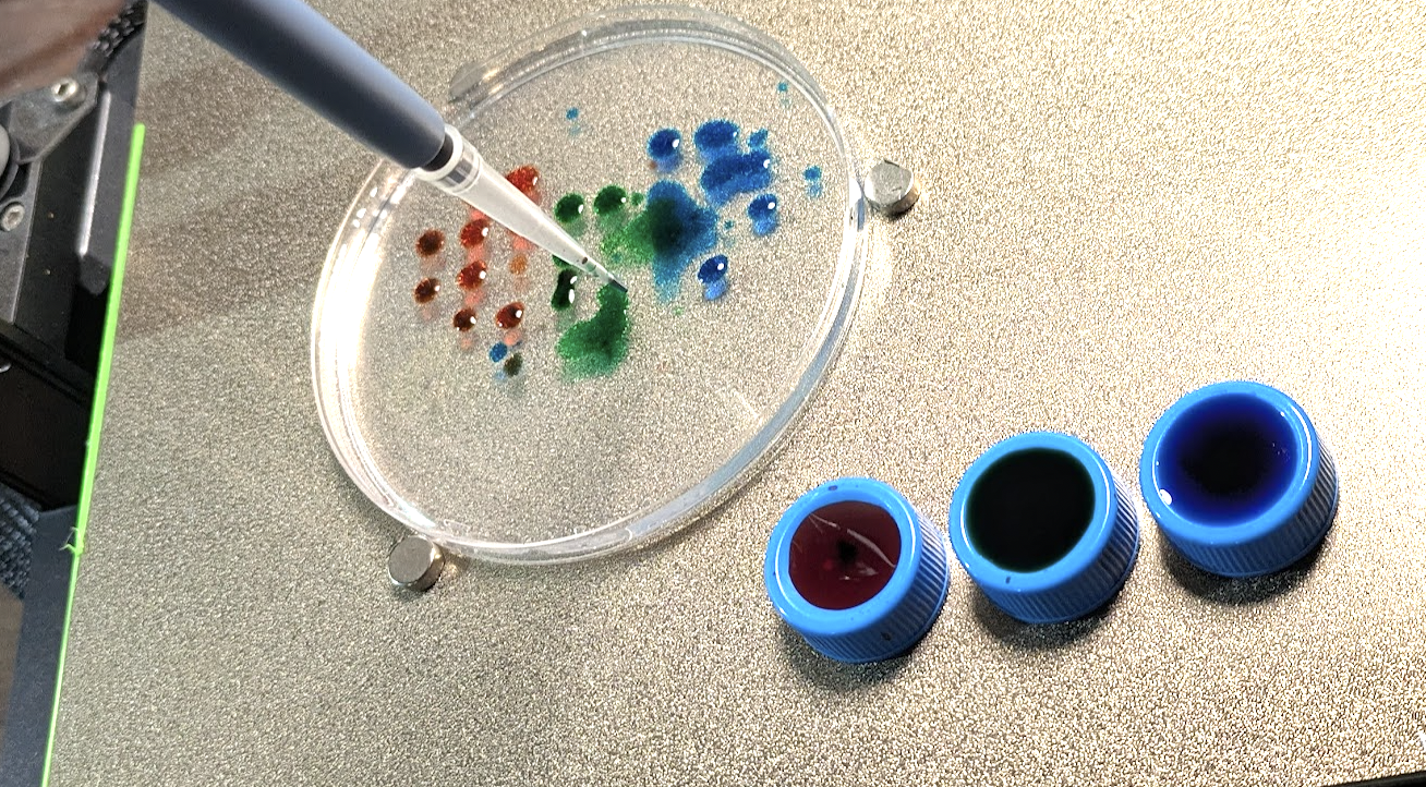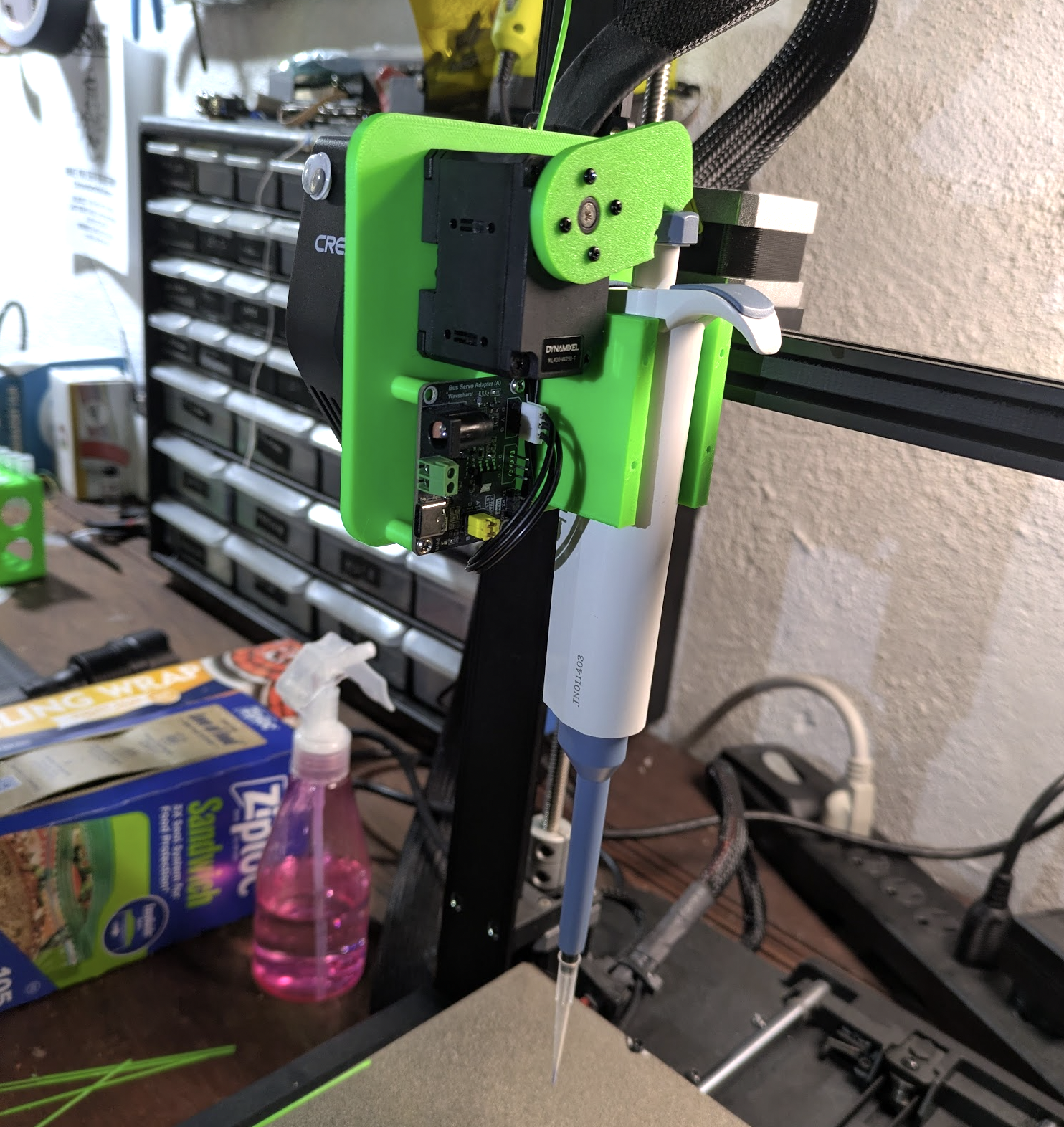 Anyway, with all that discussion fresh in my mind, one of the things I did this weekend was whip up an attachment for my 3D printer that holds my pipette and can suck up and dispense small amounts of liquid. End goal: agar art with colorful microbes, of course :D A Dynamixel servo that I had on hand pushes the plunger thingee on the pipette, with both it and the printer controlled by a raspberry pi or laptop (the latter after I ran the wrong G-Code and spilled colorful water on the former!).