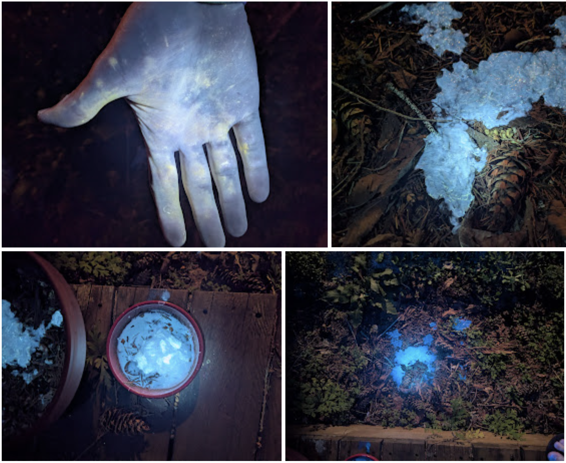 Handling the containers (post boiling + alcohol steriliation) stained my hands a lovely fluorescent yellow-green, some cool modification of the blue-fluorescing molecule(s) this makes. Neat! Invisible under regular light, and now mostly gone after a day of occasional washes and a shower.