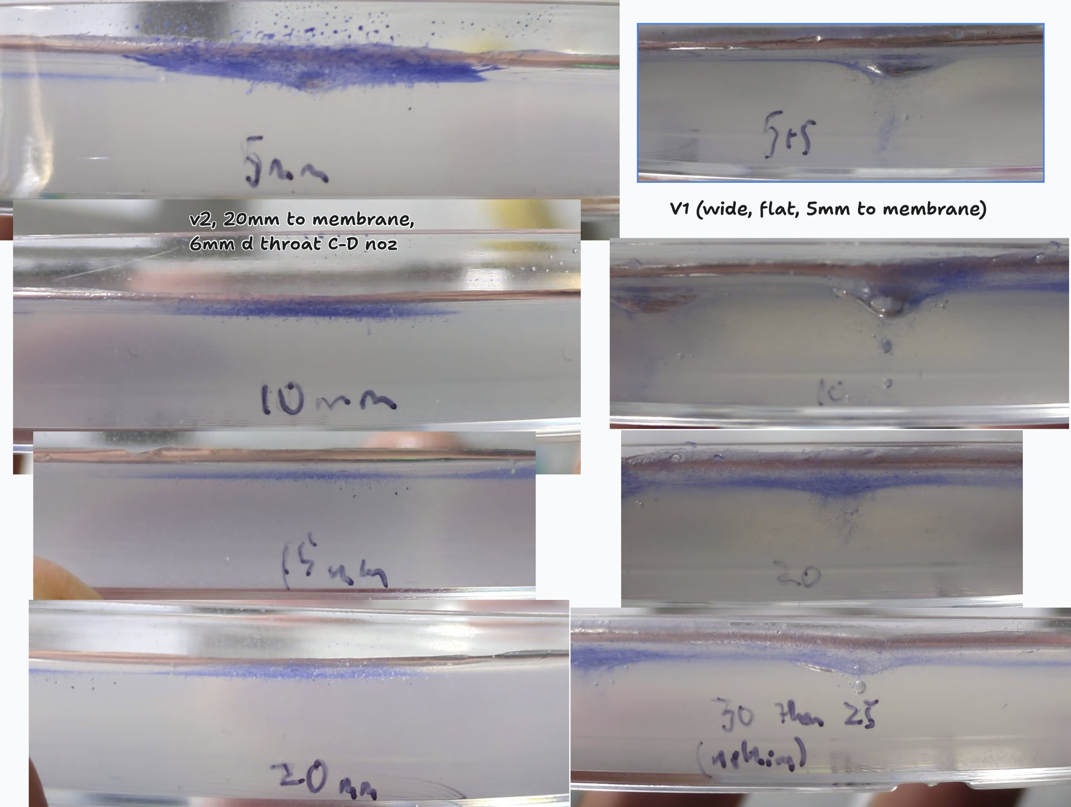 I also explored penetration. My first attempt just had a wide attachment after the barrel, with film stretched across it. You had to get close to get much penetration, which also seemed to cause damage to the agar at least (using it as a transparent stand-in for plant matter). Testing it on onion it mostly penetrated only the 1st layer of cells. So, I modelled up a converging-diverging nozzle, with the film placed in the throat, and got much nicer results - less damage from air, more even penetration of the (presumably faster-moving) particles. In onion it sent some particles 5-10 cells deep on the first try :)