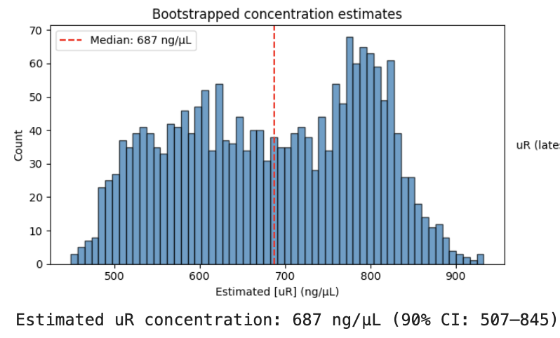 Code is here for the curious. Since the exact figures you’ll get vary depending on choices like the bounding box used in the image, I did some quick bootstrapping to give a range of values, picking a final estimate of 687 ng/µL (90% CI: 507–845).