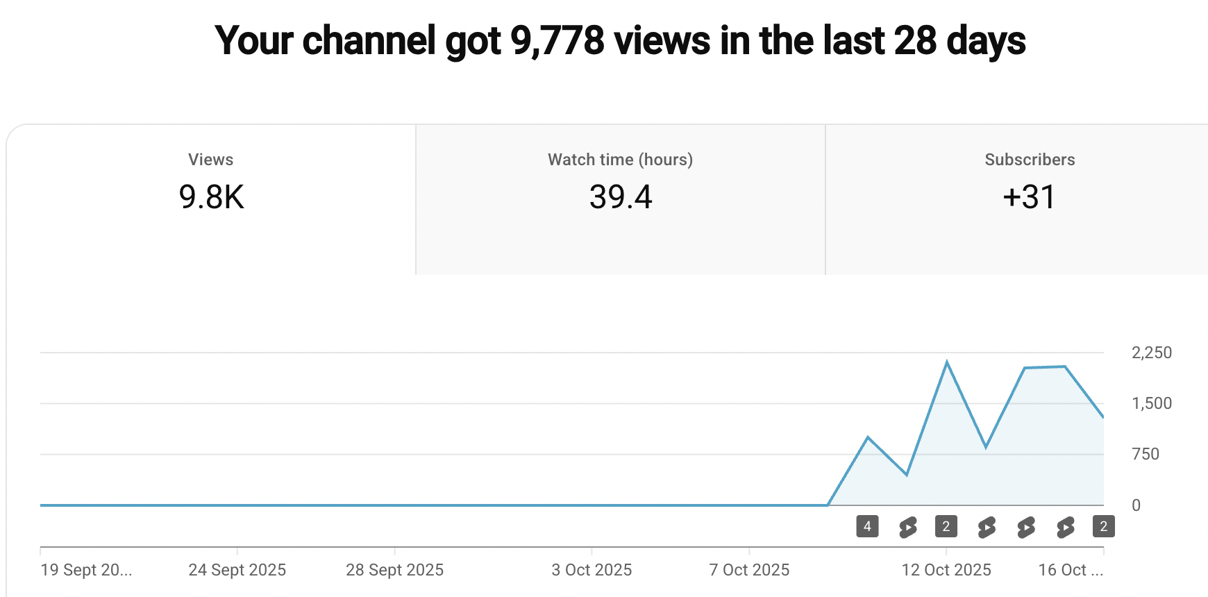 The shorts medium is one I’m very unfamiliar with, and so that aspect has been interesting too. It seems like when I post a video, it gets a spike of views in the first ~hour and then dies off, with only a few continuing to get a trickle of views after that initial burst. Still, 10k views is a lot! I hadn’t thought through how many shorts people watch. The longer background videos are getting tens of views, more in line with what I expected for a new channel not marketing or anything.