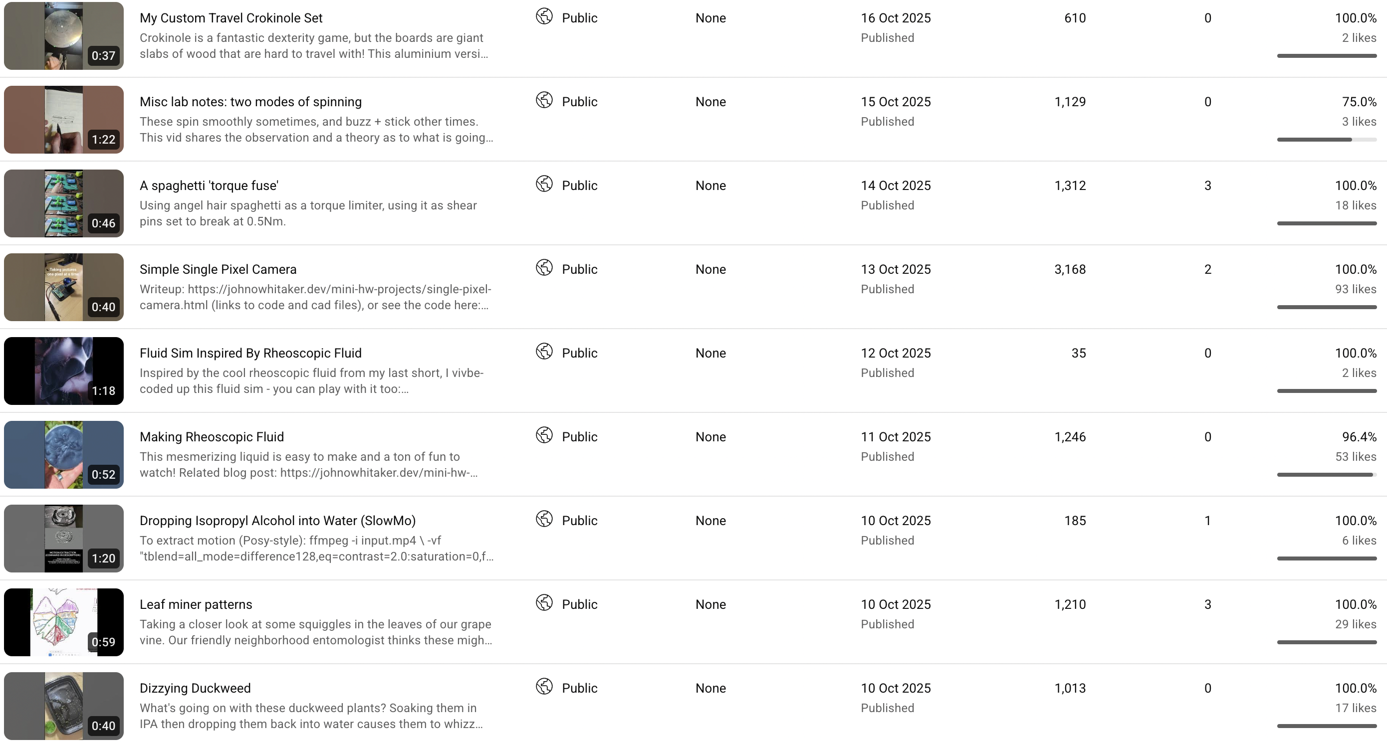 One hope in posting these was that I’d inspire a bit of curiosity in people - maybe they’d take an experiment further than I did, or see the short and come explore the longer videos for more. Alas, I suspect that most shorts viewers are much closer to mindlessly scrolling, and I’m a little worried I’m just feeding that beast.