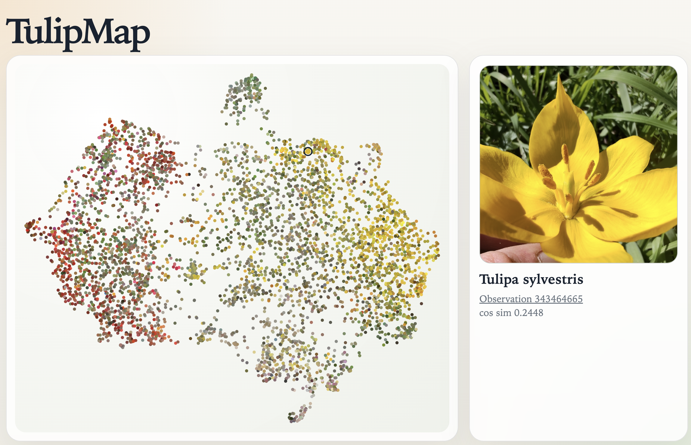 I made an interactive site to explore tulip varieties (code, video demo). The UMAP clusters of the CLIP embeddings map nicely to color and locale, made it very easy to get a general vibe for the genus - I’ll definitely be copying this for other taxa!