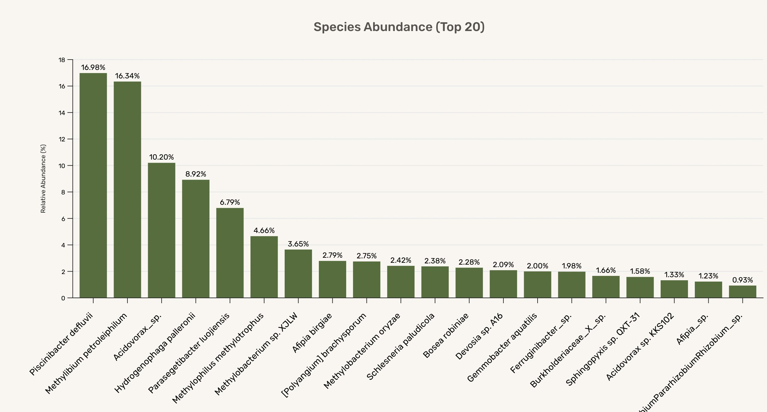 The 16S gene is “highly conserved between different species of bacteria and archaea” and gets used to tell what somethig is without reading the whole genome - perfect for analysing environmental samples, gut bacteria etc. Plasmidsaurus will give you the raw reads, but they also do some processing to tell you some relative abundances of different species present (see above). In my case, it turns out these flocs are not a siongle species but instead a whole happy community of microbes! It’s fun to start researching and figuring out who might be doing what. Preliminary poking tells me this is not an unusual mix for a watery, nutrient-rich environment. Cool to see some Methylobacterium present - wonder how they’re getting food.